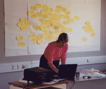 The key is that by writing ideas on the ovals, placing them on the appropriate place on the wall, and adding links between them, the participants develop a shared understanding of the issue under consideration. Depending on the requirements, further ovals can then be used to work out a possible action plan.